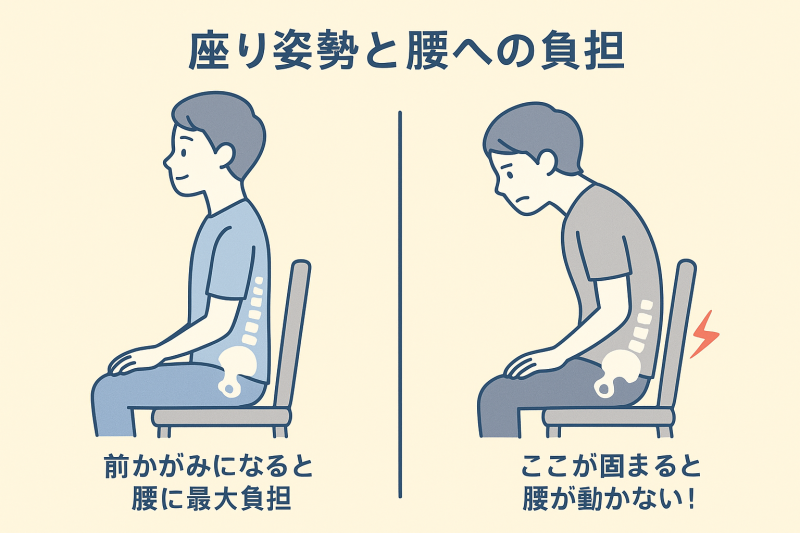 背骨のS字カーブが崩れ、腰椎の椎間板(クッション)が強く圧迫されます。