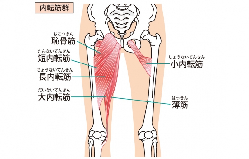 内ももの筋肉群(長内転筋・短内転筋・大内転筋など)。ここが硬くなると骨盤の動きがロックされ、腰の可動域が減少。